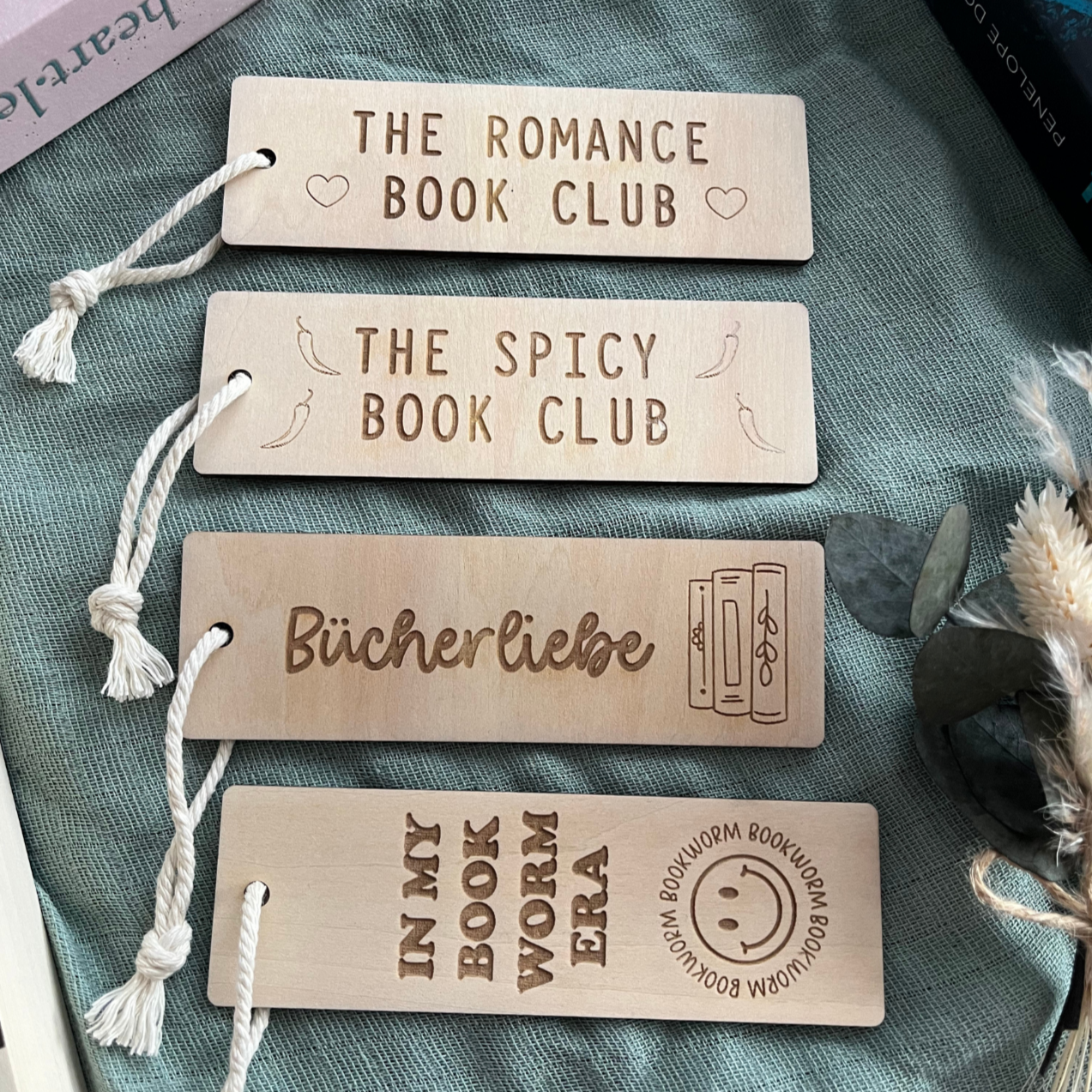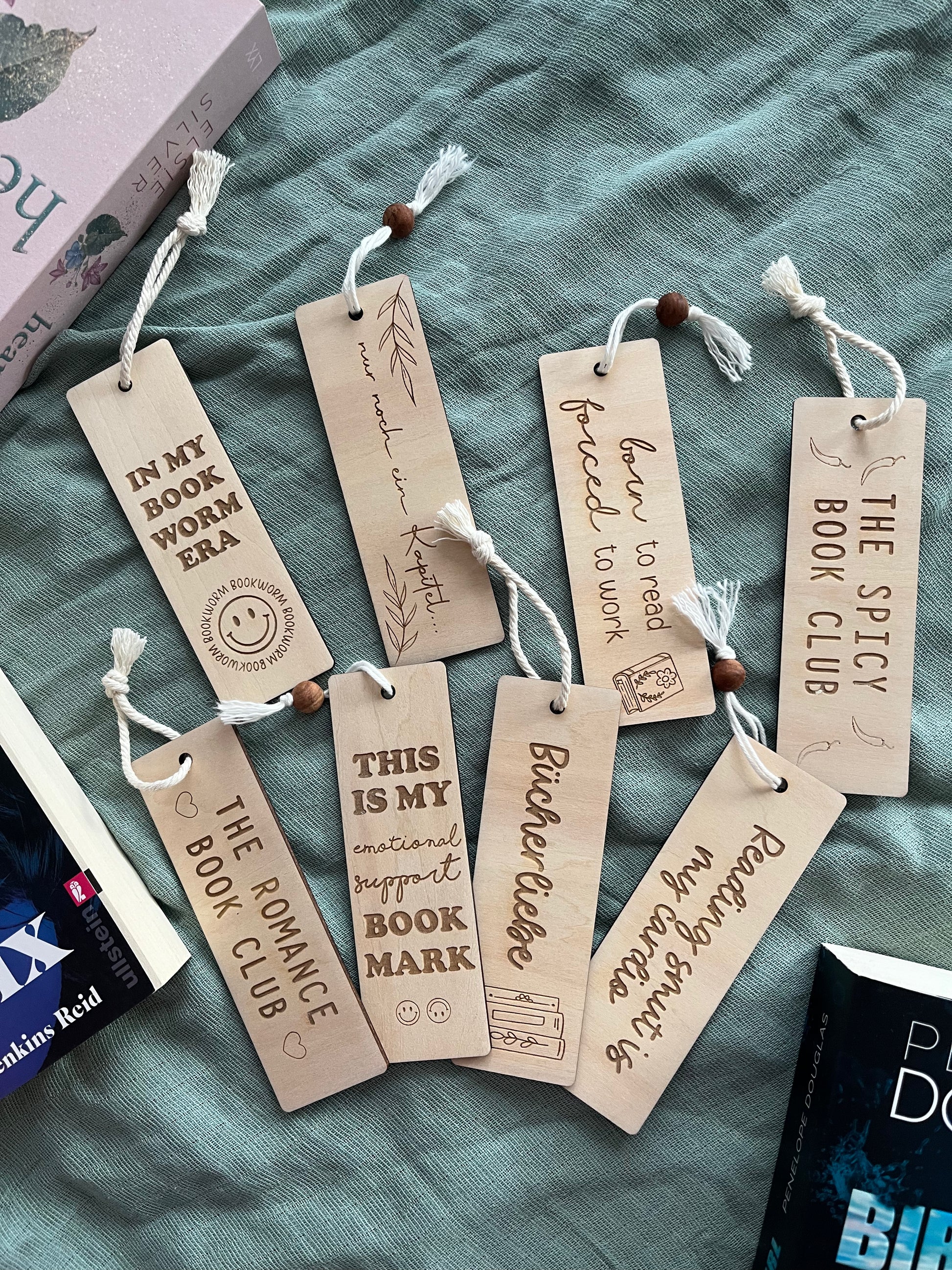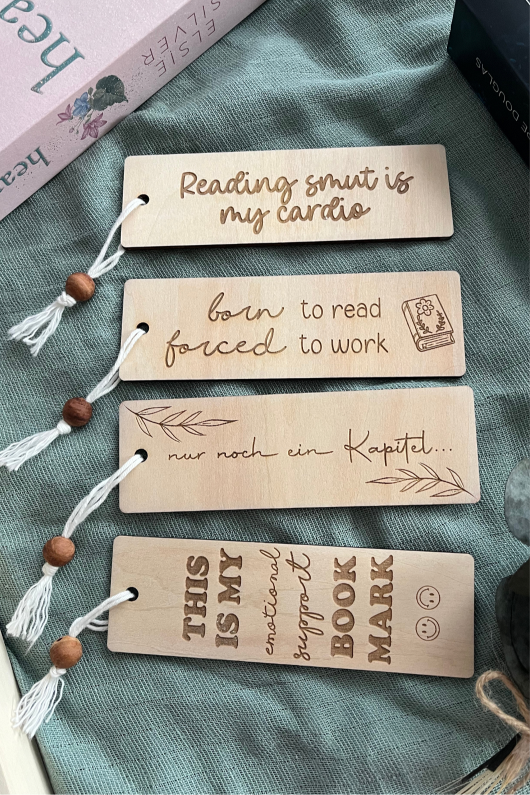 Unsere feinen Holz-Lesezeichen mit Gravur und eleganter Quaste sind ideal für alle, die gern lesen – ob bei #BookTok-Trends oder auf dem Sofa. Der moderne Spruch „Bücherliebe“, „Nur noch ein Kapitel“ oder „Reading Smut Is My Cardio“ macht jeden Lese-Moment persönlich und cool. Perfekt für deine Leseecke, um dein Buch-Setup auf Instagram oder TikTok zu zeigen.
