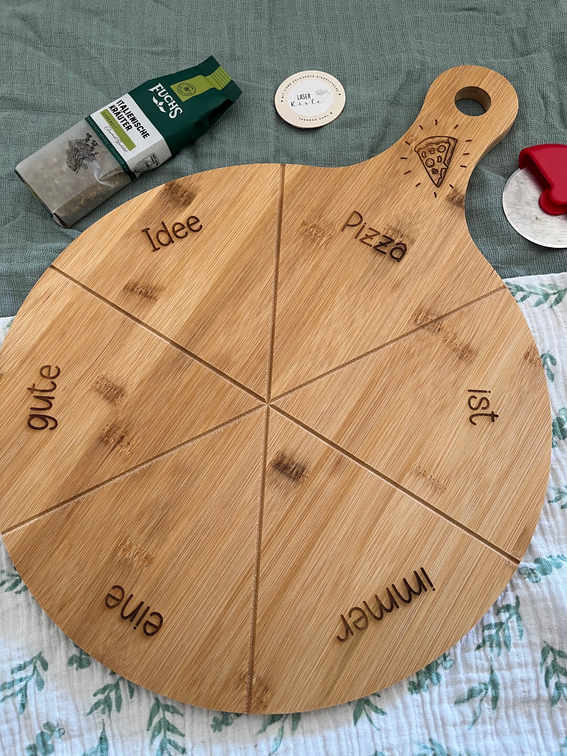 Unsere Pizzateller bestehen aus echtem Bambus. Als Naturmaterial weist Bambus unterschiedliche Fasern, Dichten und Leimanteile auf. Dadurch kann die Lasergravur stellenweise heller oder dunkler ausfallen oder leicht uneben wirken.