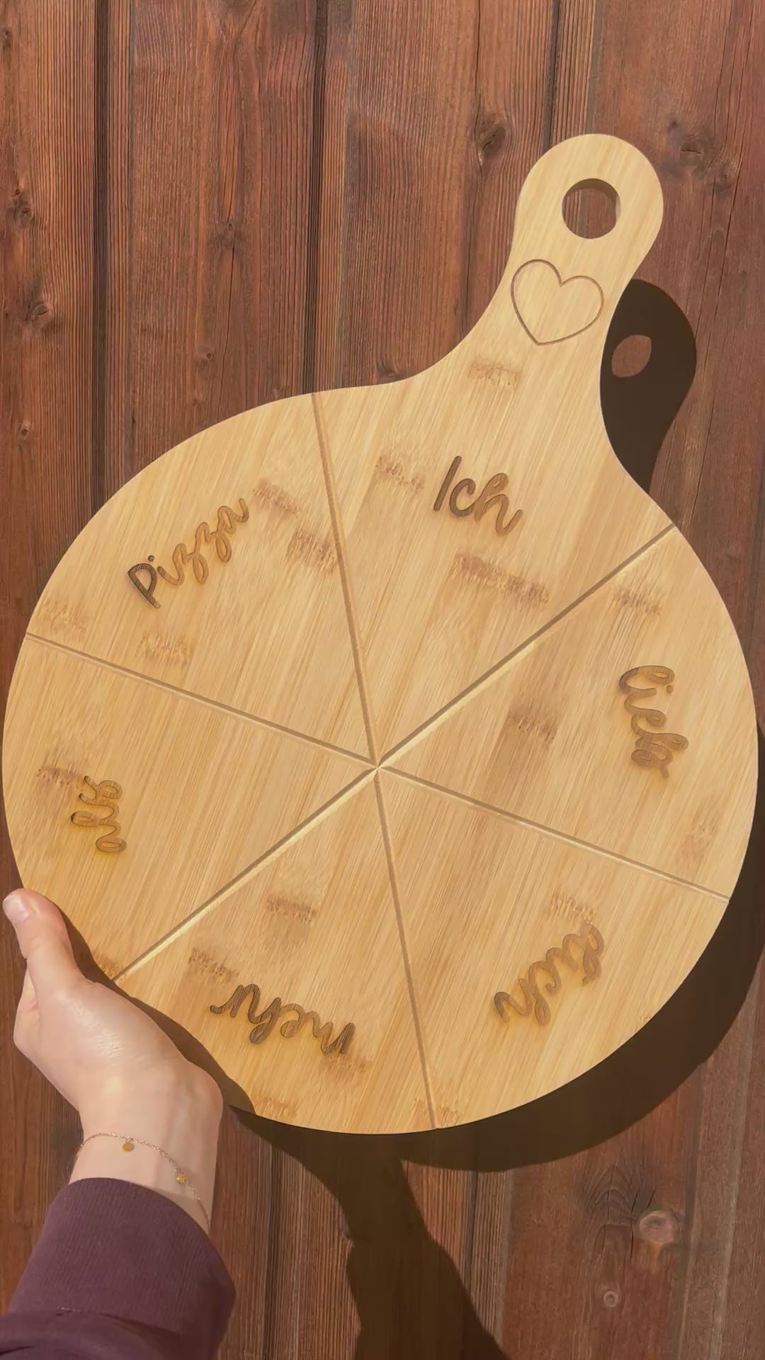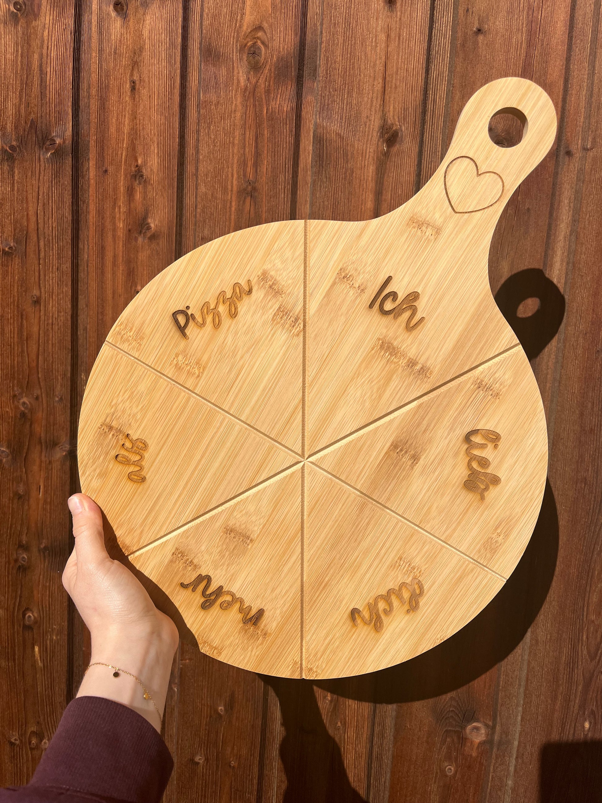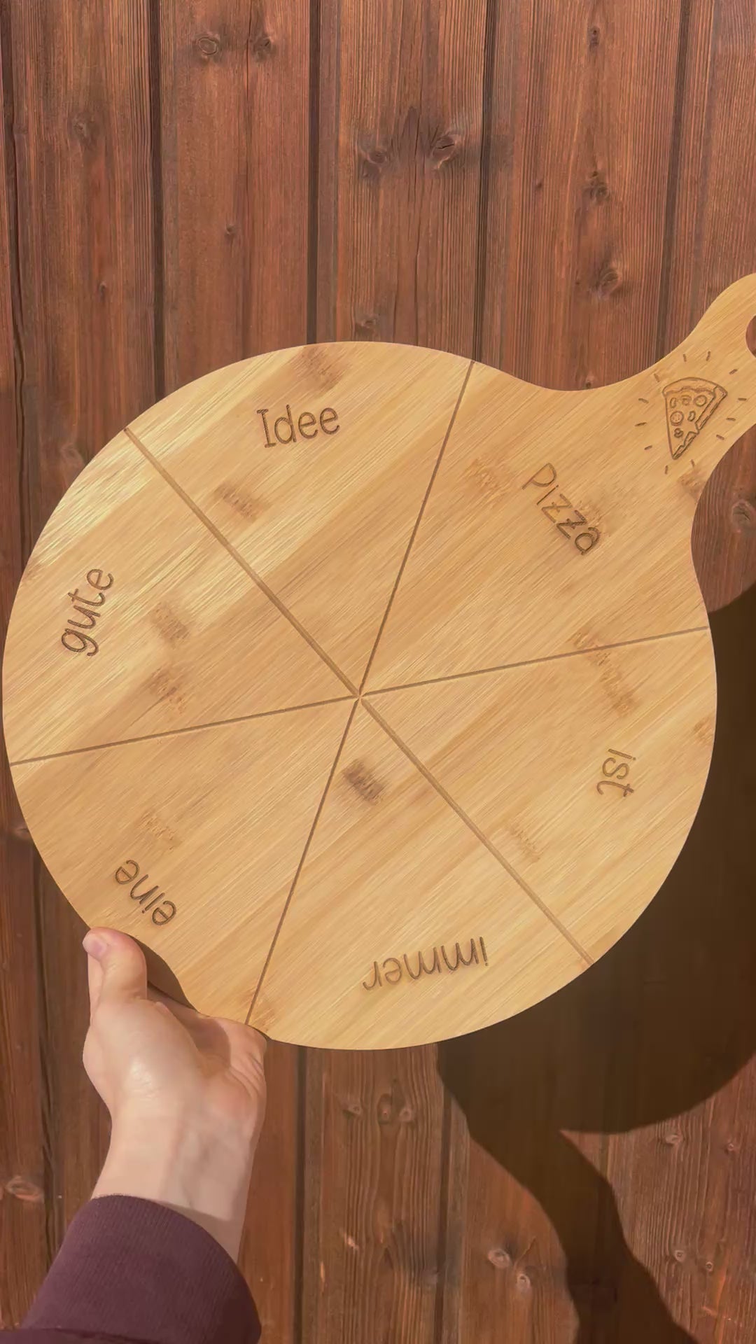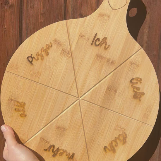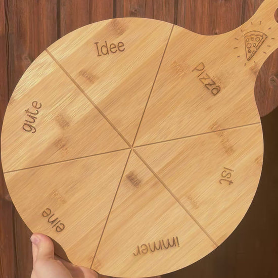 Unser hochwertiger Pizzateller aus Bambus (ca.Ø 33 cm / mit Griff ca. 45x33 cm) wird individuell mit Namen oder Wunschtext graviert – ein einzigartiges Geschenk für Pizza-Fans, Familienabende oder gemütliche Date Nights.